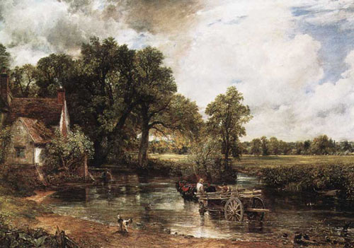 작품설명 : 여름의 얕은 냇물 위를 건너는 건초 수레가 조용하고 한가로운 전원 풍경으로, 하늘이며 원근경의 수목의 가지 끝에도, 빛과 그늘이 짙게 연주하며, 색채는 청신하게 숨쉬고 있다. 1824년 파리의 살롱에 출품되어 금상을 수상한 작품이다. 들라크르와는 이 작품의 빛과 색채의 미묘한 표현에 감명을 받아 자신의 작품 <키오스섬의 학살>을 수정했다고 한다. 전원풍의 이 작품에서 상쾌한 대기는 밝고 맑은 빛과 그 반사로 그늘과 밝은 면으로 대조되어 빛의 절대성을 알려준다.